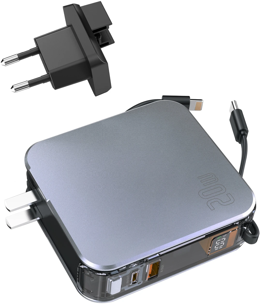 Mit vier Ladeanschlüssen bietet dieses Gerät maximale Flexibilität. Ob Smartphone, Tablet, Kopfhörer oder Smartwatch – alles lässt sich problemlos aufladen. Die integrierten USB-C- und Lightning-Kabel ersparen dir das Mitführen zusätzlicher Kabel, während die beiden USB-Anschlüsse (USB-C und USB-A) dafür sorgen, dass du alle Geräte gleichzeitig laden kannst. Keine Wartezeiten mehr und kein lästiges Suchen nach einem freien Port!
